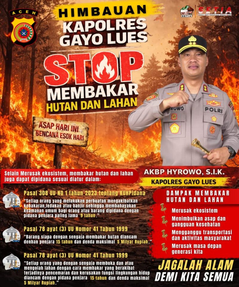 Polres Gayo Lues juga menegaskan komitmennya untuk terus melakukan upaya pencegahan serta penegakan hukum terhadap pelaku pembakaran hutan dan lahan demi menjaga kelestarian lingkungan dan keselamatan masyarakat.